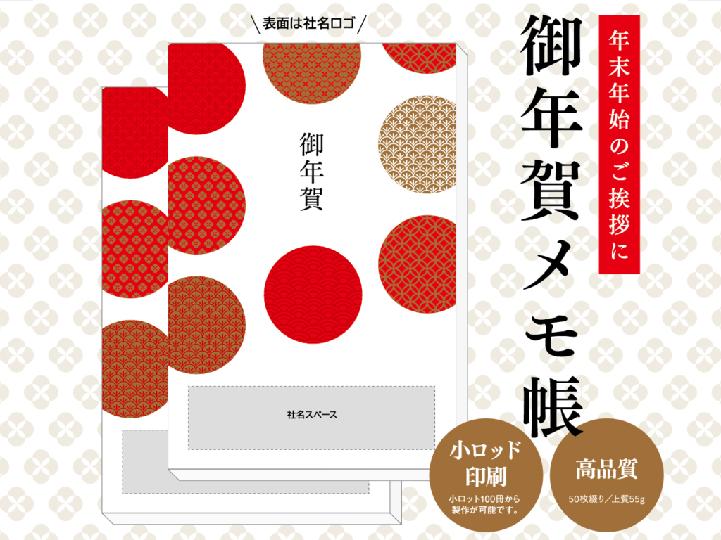 年末年始のご挨拶に当社オリジナルの「御年賀メモ帳」はいかがでしょうか?今回のメモ帳は、表紙のみ社名入り(名入れ)のシンプルデザイン!さりげないアピールで新年のご挨拶にちょっとした贈り物で、お客様との距離も近づくはず! 裏